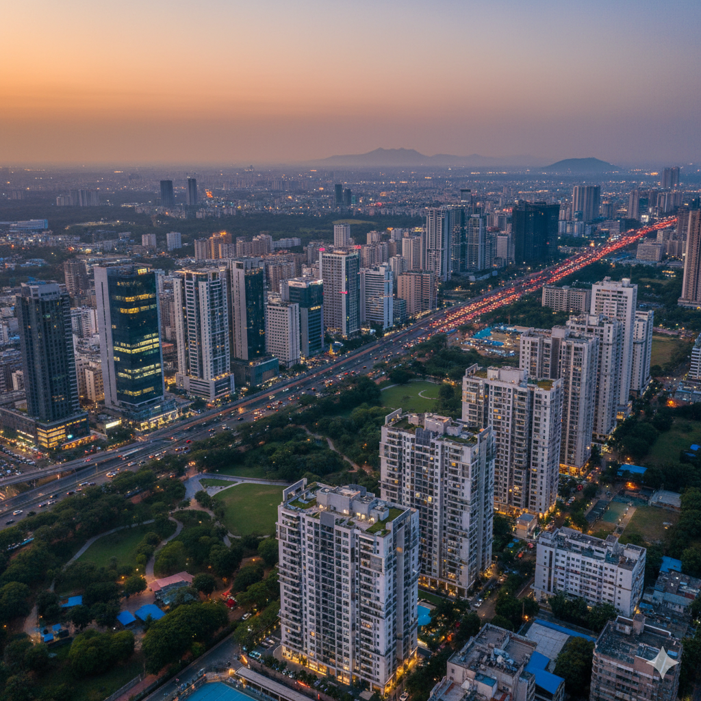 A panoramic view of modern apartments with the Bengaluru viewline in the area.